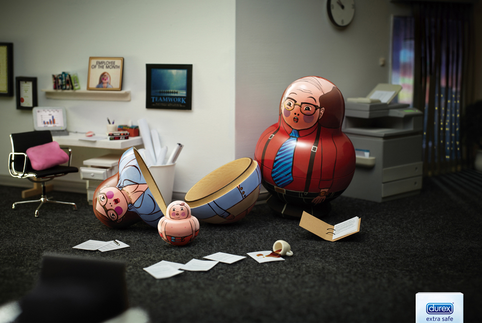 Hand painted wooden Russian dolls set in a diorama for a campaign for Durex International in 2012.