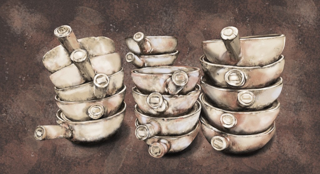 As I reached under the kitchen counter to pick out some unique pieces to photograph as research. I noticed how the claypots were stacked in an orderly fashion like towers with the claypot handles forming a cascading wave. I was like, that’s it. I got my layout.