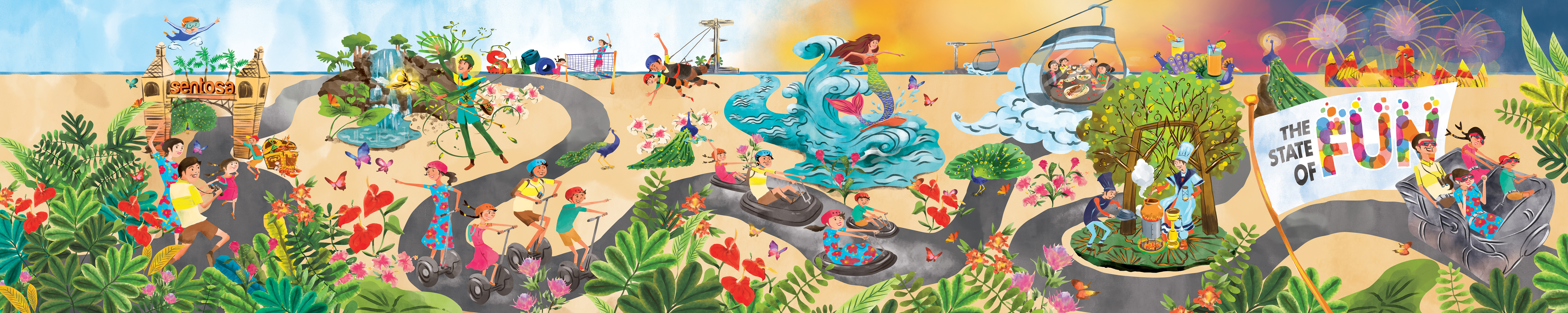 The whole idea was to feature Sentosa in a panoramic illustration that captures the highlights of Sentosa together with STB Passion Ambassadors that make up a story. To accommodate the use of the key visual on multiple platforms. The illustration is sectioned into 5 sections that can be used individually but could be used a single seamless panoramic format when all 5 sections are put together.